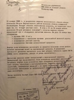10 января 1989 г. в результате падения неопознанного объекта вблизи поселения Второе Каргасокского района возникла область повышенной температуры. Вокруг объекта образовалась мокрость, на территории около двух кв. км. растаял снег… Внутрь зоны потепления проникнуть не является возможным из-за резкого влияния магнитных полей на человеческий организм. В результате временного усиления магнитного поля было утеряно табельное оружие ПМ ГА 1692Д (есть свидетель, рапорт об утере прилагается)."