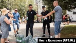 – Не снимайте нас, мы с сигаретами! – просит один из участников акции, который еще до начала сбора митингующих организовал раздачу воды. – Мы ж видим, жарко, вот и приехали. Сами по себе. А сигареты не надо в кадр, а то какой-нибудь Соловьев опять скажет: только гопники в Хабаровске митингуют.