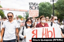 В Хабаровске сегодня около 27 градусов – довольно жарко, но колонна уверенно возвращается на площадь перед зданием правительства региона – митинговать. В общей сложности митинг на сей раз продолжался около пяти часов. Помимо лозунгов "Свободу Фургалу", "Я/Мы – Сергей Фургал", "Хабаровск своих не бросает" все чаще звучали "Путин – вор", "Чемодан – вокзал – Самара", "Дегтярев – иди в баню".
