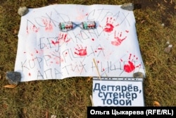 Отметился нынешний митинг еще двумя акциями. Несколько женщин предлагали всем желающим надеть майки и рваные белые футболки, измазанные красной краской, символизирующей кровь пострадавших в прошлую субботу.