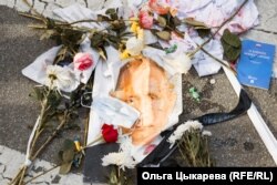 После того как митингующие вернулись на площадь, один из них бросил перед крыльцом правительства портрет Путина. Сначала к нему положили цветы с черной лентой, затем стали топтать его, кто-то плевал, кто-то бросал мелочь как подаяние, кто-то, как на могиле, поставил рюмку и конфеты.