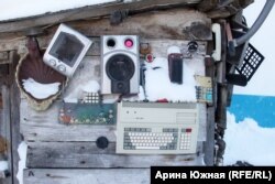 Сразу у входа во двор, на дощатой стене сарая, можно увидеть, как говорит сам Гришаев, "набор всякой ерунды"– висящие компьютерные клавиатуры, колонки от музыкальных центров, телефонная трубка…