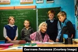 – На этом кадре учительница русского и литературы Зинаида Евстигнеевна. Она родилась в Сураново и, выучившись в институте, вернулась обратно. Всю жизнь преподаёт в местной школе. И сегодня работает, хотя ей уже за восемьдесят. Говорит, "в школе и умру". От Сураново до Тайги 30 км по железной дороге. Автомобильного сообщения с Тайгой четыре года назад, по сути, не было. Дорогу сорок лет обещали построить, но, в отличии от Томска, который всё-таки 60 км асфальтного полотна проложил, Кемеровская область выполнять свои обещания не торопится.