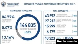 Большая часть доносов, по данным ведомства, касалась "размещения в интернете противоправной информации, в том числе так называемых "фейков" о войне России против Украины. Чаще всего россияне обращались с просьбой заблокировать ресурсы с "проукраинской пропагандой".